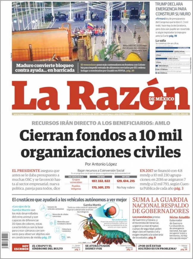 Diarios de México y sus portadas del 15 de Febrero 2019